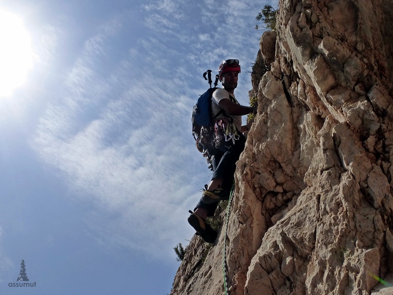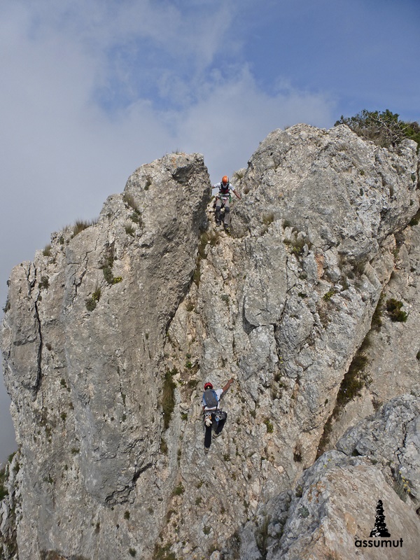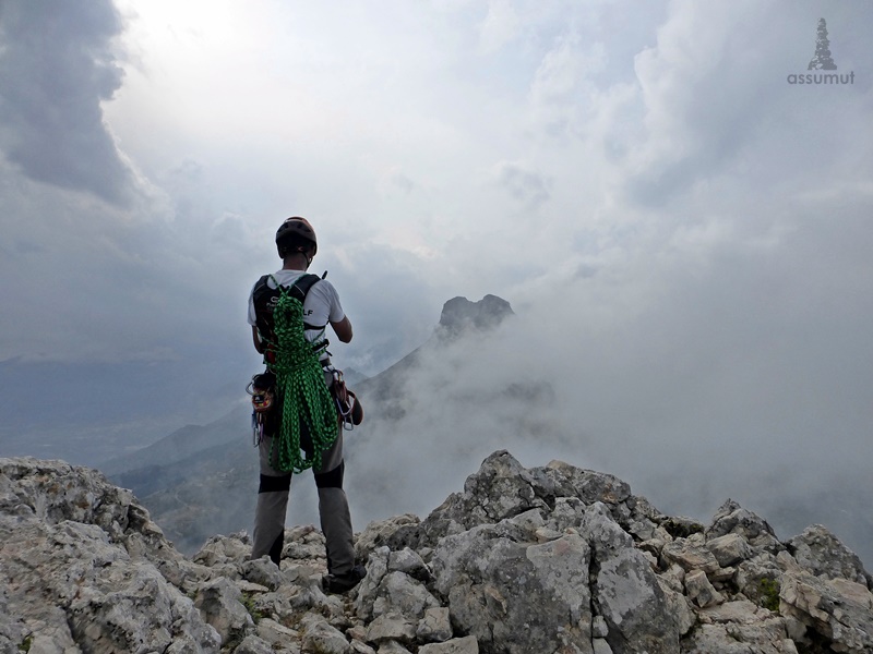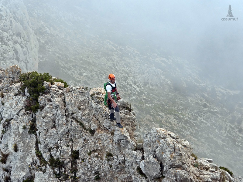 11 largos de escalada, 10 horas y media de actividad, 1300 metros de desnivel, sin contar todas las subidas y bajadas y un ambiente de monte muy guapo, cresteando entre nubes bajas.