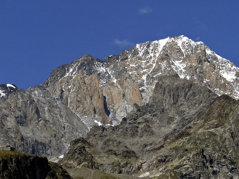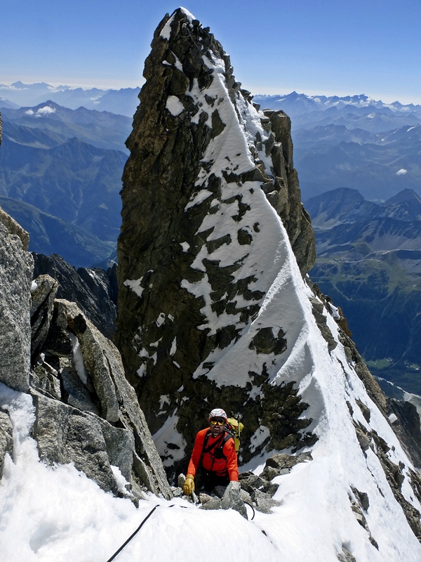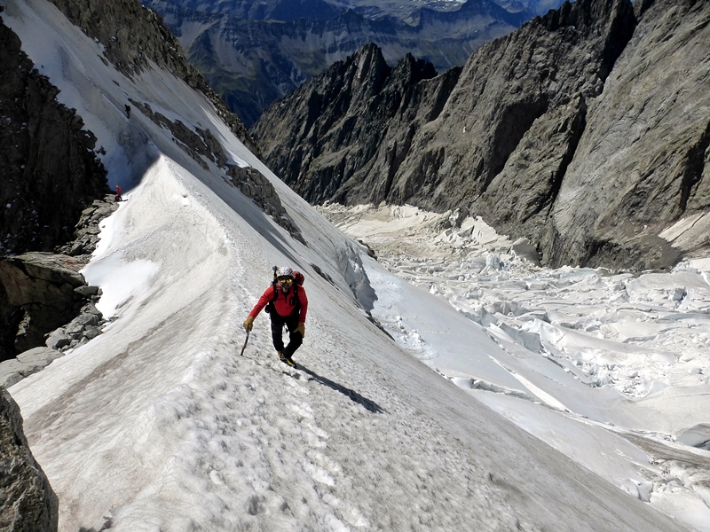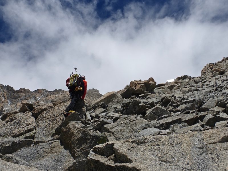 Remontamos la morrena tendiendo a la derecha del glaciar y con unos pasos entretenidos nos montamos en la arista que lleva a la punta Innominata. Seguimos esta arista rocosa subiendo cumbres secundarias y bajando a los collados nevados, nosotros optamos por ir desencordados y destrepar, pero en algún punto se puede echar de menos la cuerda.
