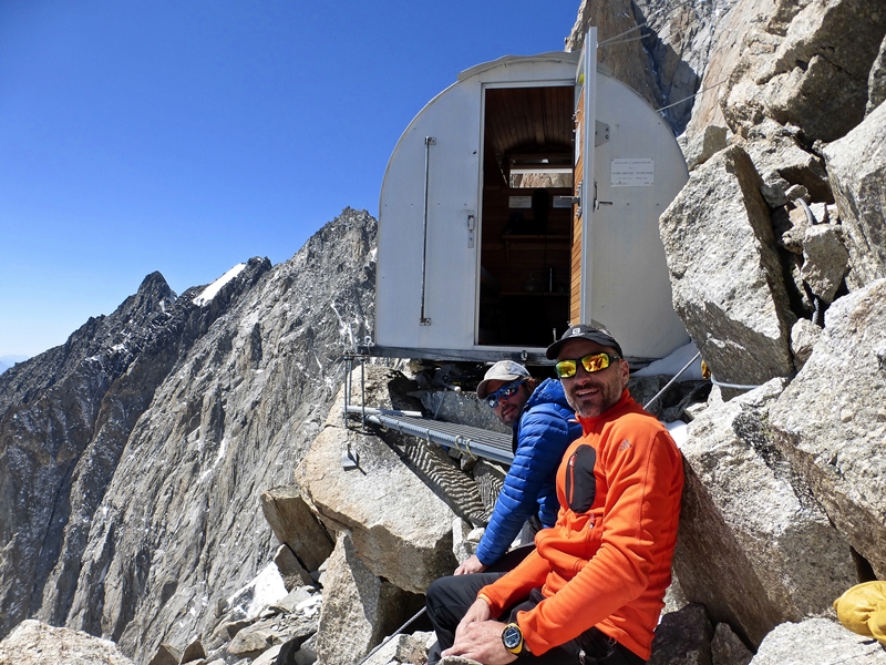 Desde la punta Innominata bajamos al ultimo collado y desde aquí a trepar hasta el pequeño refugio. Fuimos al más alto de los dos que hay, el de abajo le ha caído un bloque encima y esta un poco perjudicado, menos de lo que esperábamos, pero el de arriba es un hotel de cinco estrellas…