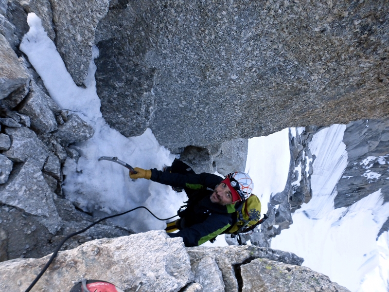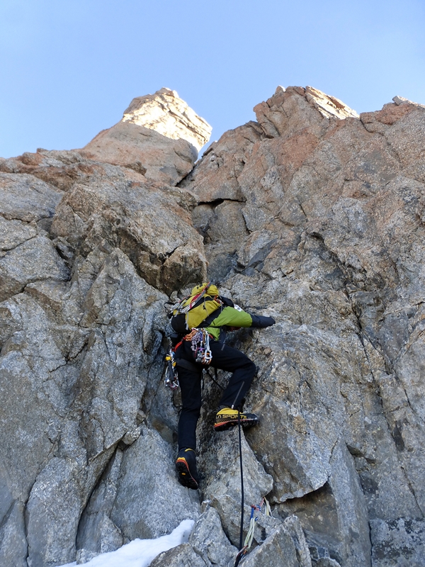 La ruta esta mucho mas seca de lo que esperábamos y los tramos de hielo y nieve están delicadillos pero la progresión es rápida, incluso con un crampón roto la tarde del día anterior que me da un poco de inseguridad al moverse la bota dentro del crampón, gajes del oficio…