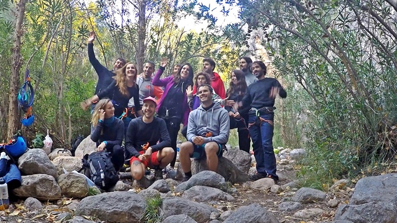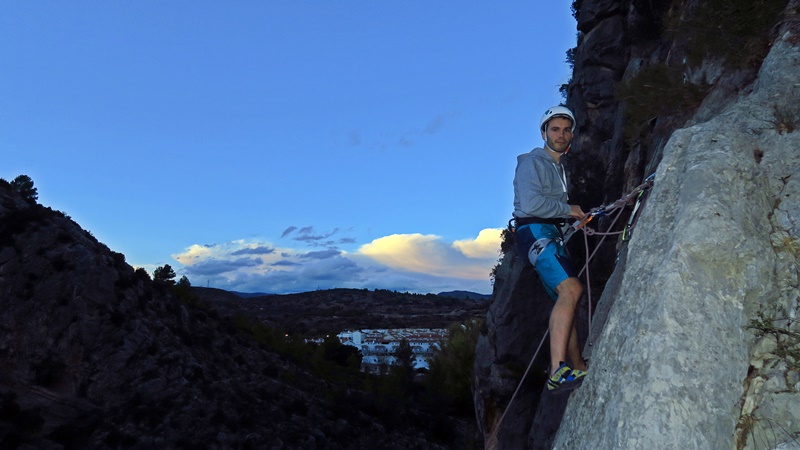 El primer dia estuvimos en la clásica escuela Valenciana de Jérica. Allí conocimos a los once participantes y empezamos con dando un buen repaso al material que se utiliza en escalada deportiva. Y a ver las maniobras básicas y recomendaciones de seguridad para la escalada en top-rope. Hasta que casi nos cogio la oscuridad.