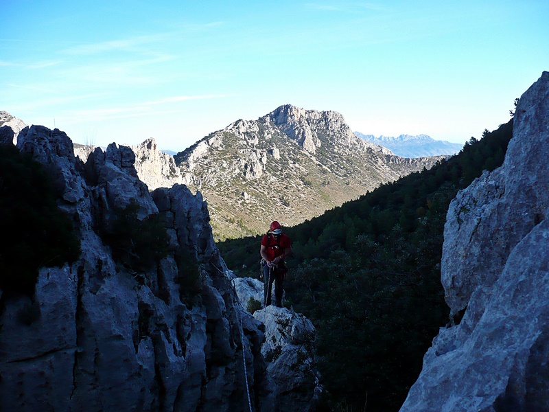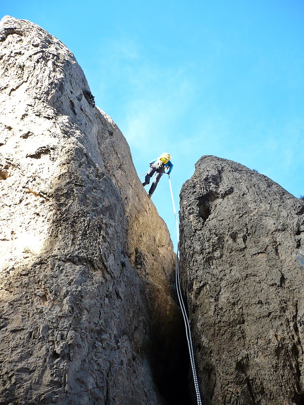 Seguimos con travesías, rapeles, bonitas fisuras y diedros, tramos de afilada arista y algún paso curioso para pasar de un bloque a otro.