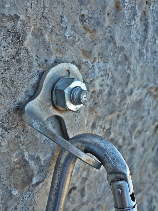 Los primeros parabolts que nos encontramos están un poco desacertadamente elegidos ya que el anclaje es bricomatado y las chapas inoxidables,con el problema de corrosión que esto trae consigo.