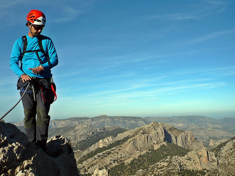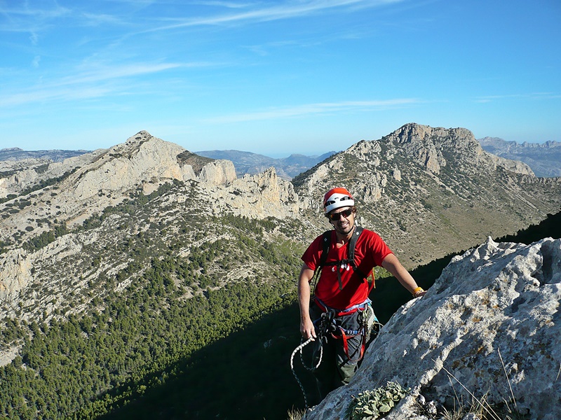 Y al mirar atrás, el Cabal con sus desafiantes Placas del Eco, la cumbre del Ponoig con el Tozal asomando por debajo y la arista de la Sierra de Bernia al fondo.
