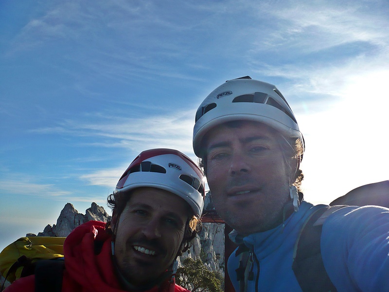 Desde esta reunión y dependiendo de la longitud de cuerda que llevemos podemos alcanzar la cumbre de la aguja en uno o dos largos de terreno de aventura total. Ningún rastro de nada, nuestra intuición nos guiará por fisuras, diedros y canales hasta el punto más alto, donde una gruesa sabina nos permite montar una reunión lo suficientemente sólida. Dejamos bien marcada la cumbre, para que no haya dudas.