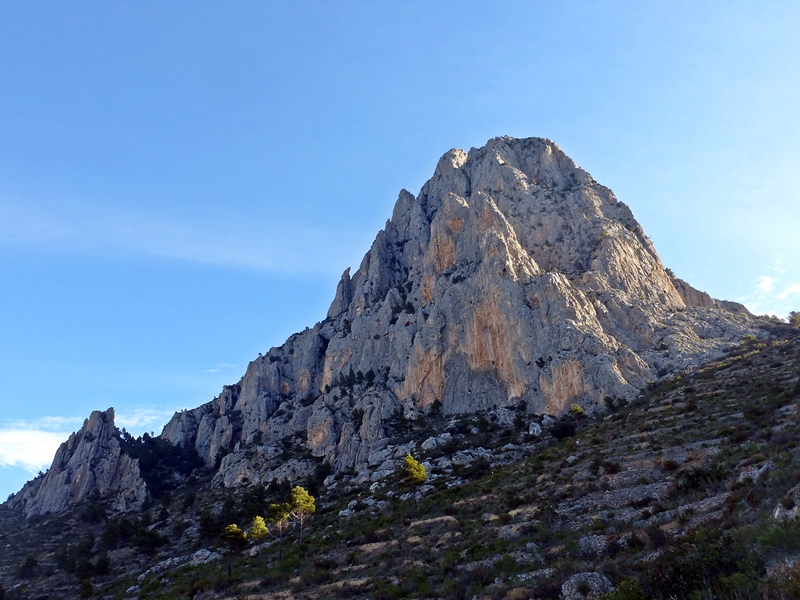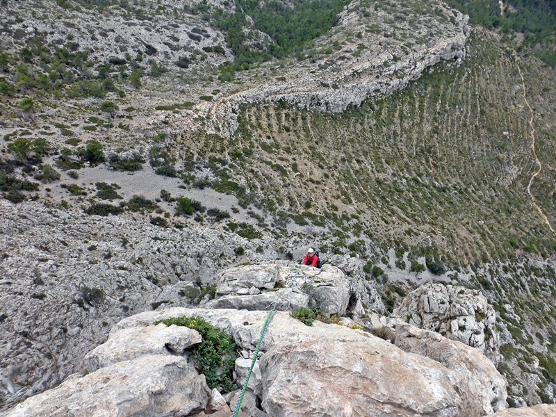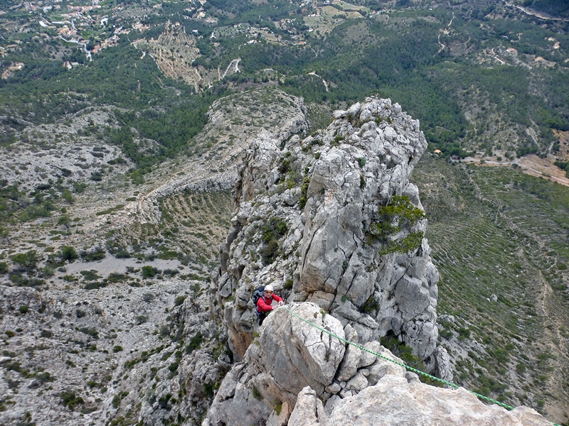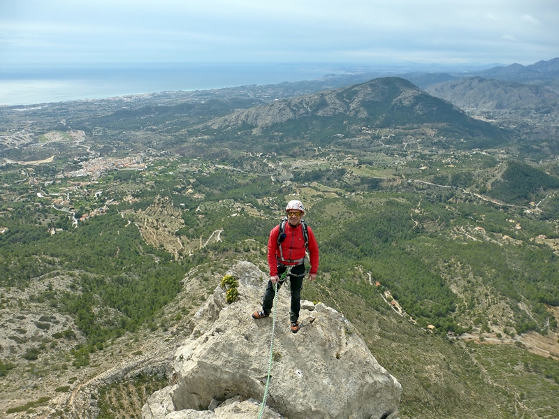 Una vez en la cumbre unos destrepes nos llevan al collado que separa la aguja con la mole principal del Puig Campana. Y desde aquí con varios rápeles y destrepes llegamos a su base por el Barranc del Infern.